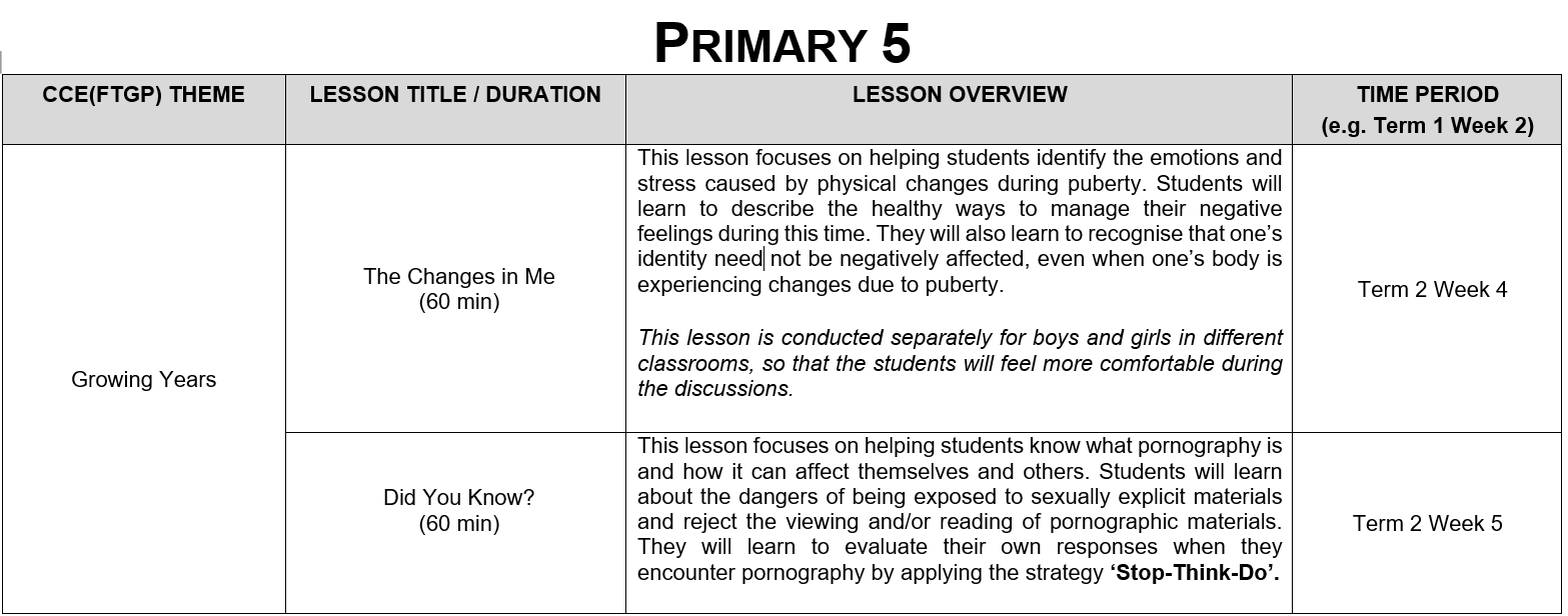 6. The upper primary years mark the onset of puberty. With better nutrition and improved health care, children are reaching puberty at a younger age and have to grapple with physical, emotional and psychological changes in themselves. The implication is that our children are becoming biologically ready for sexual activity sooner without necessarily having the corresponding cognitive or emotional maturity to modulate their behaviours. Furthermore, our young are also exposed to a wide range of influences that could endanger health and undermine the integrity of the family. Our students require close guidance so that they can respond with discernment to the sexual messages in the media and other sources.