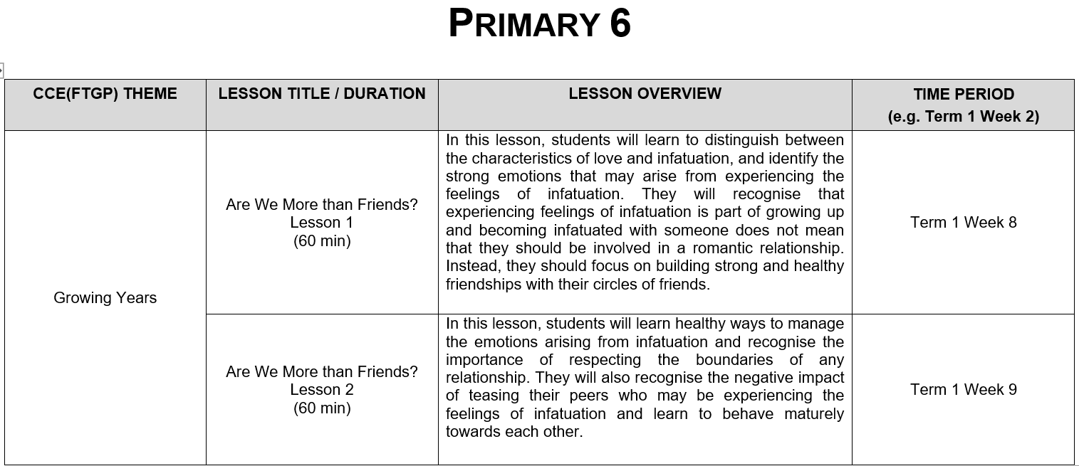 At Qihua Primary School, the following Sexuality Education lessons will be taught in 2026: